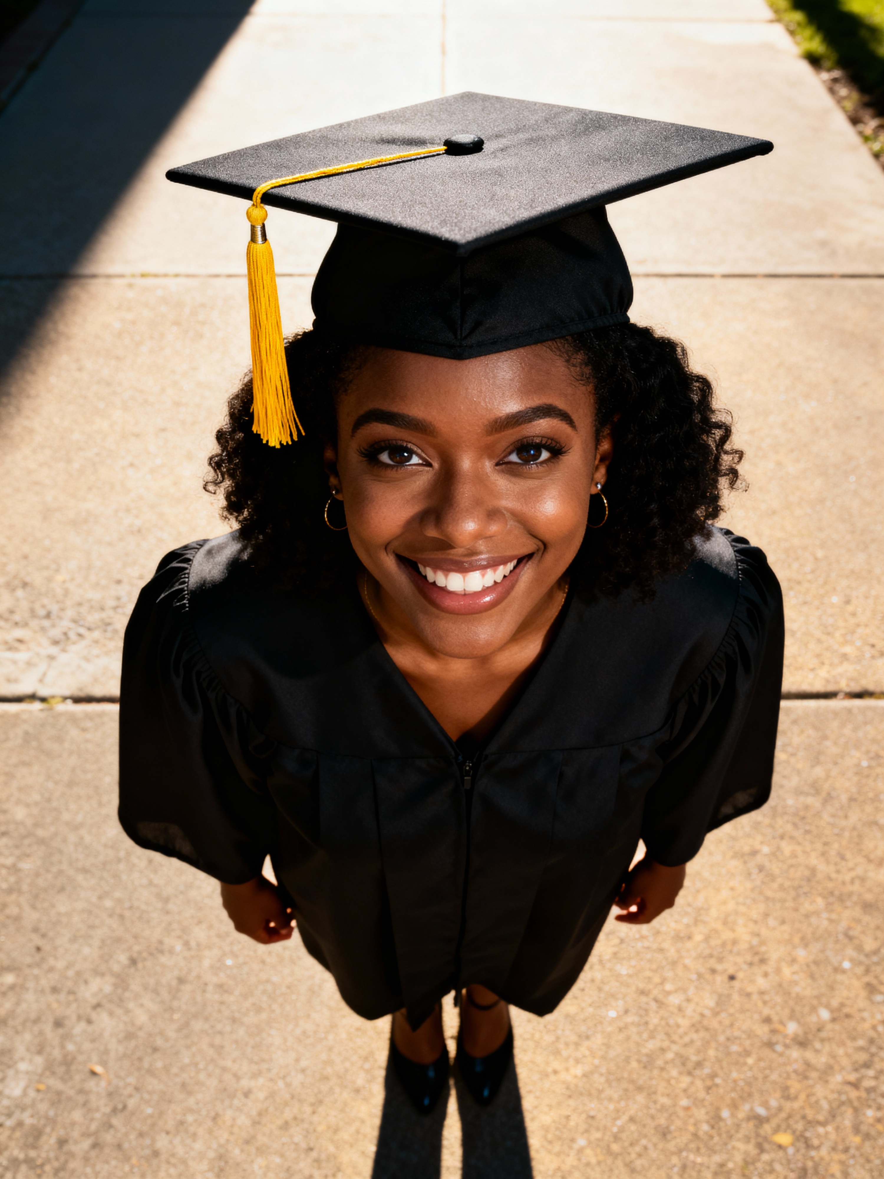 happy model in Graduation Ceremony wearing a square black Graduation Cap with yellow tassel at college