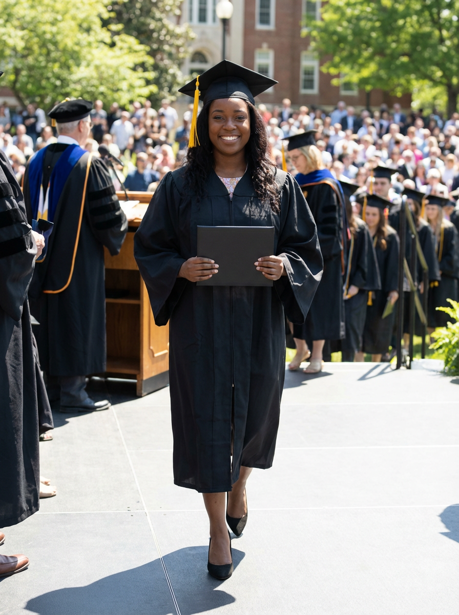 happy model in Graduation Ceremony wearing a square black Graduation Cap with yellow tassel at college