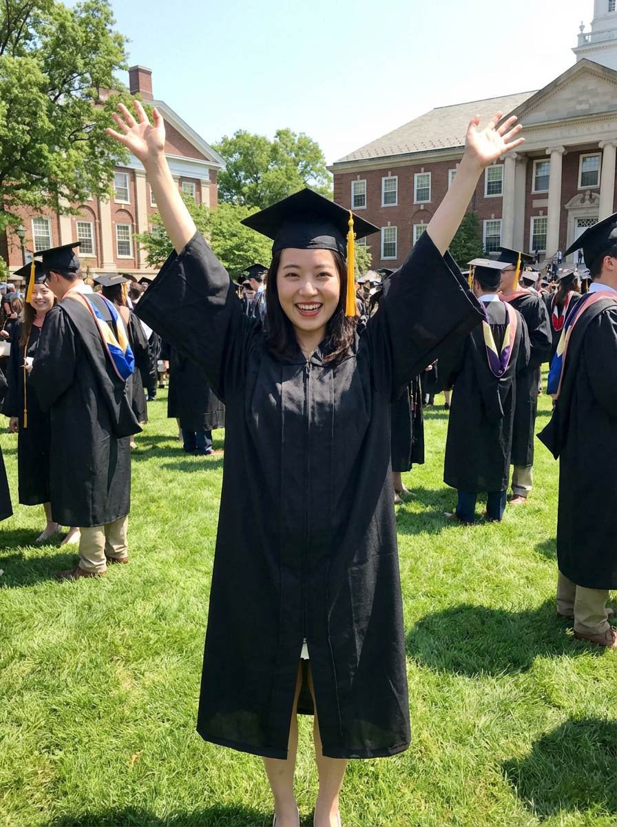 happy model in Graduation Ceremony wearing a square black Graduation Cap with yellow tassel at college