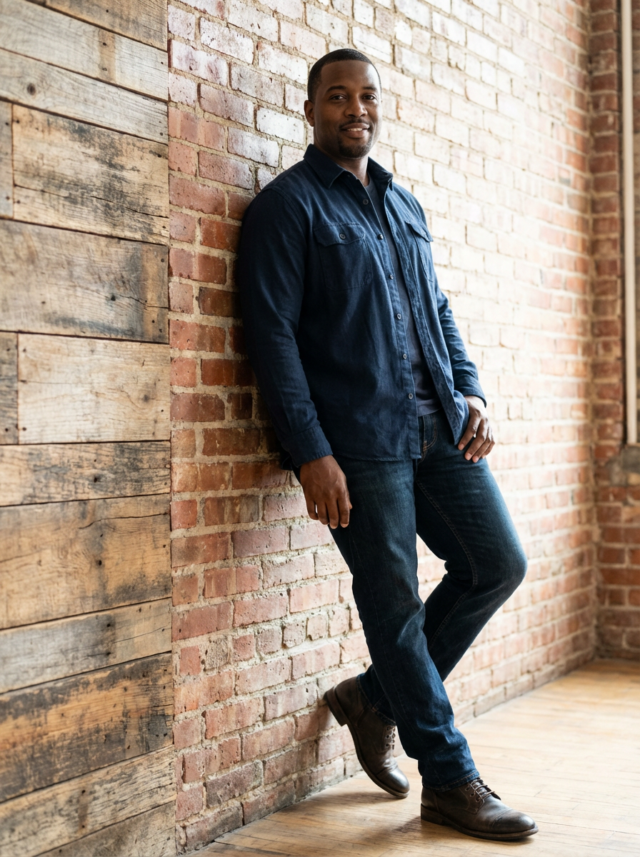 headshot of model, confident gaze, slightly smiling, against a simple textured wall (brick or wood), well-fitted stylish top, natural look