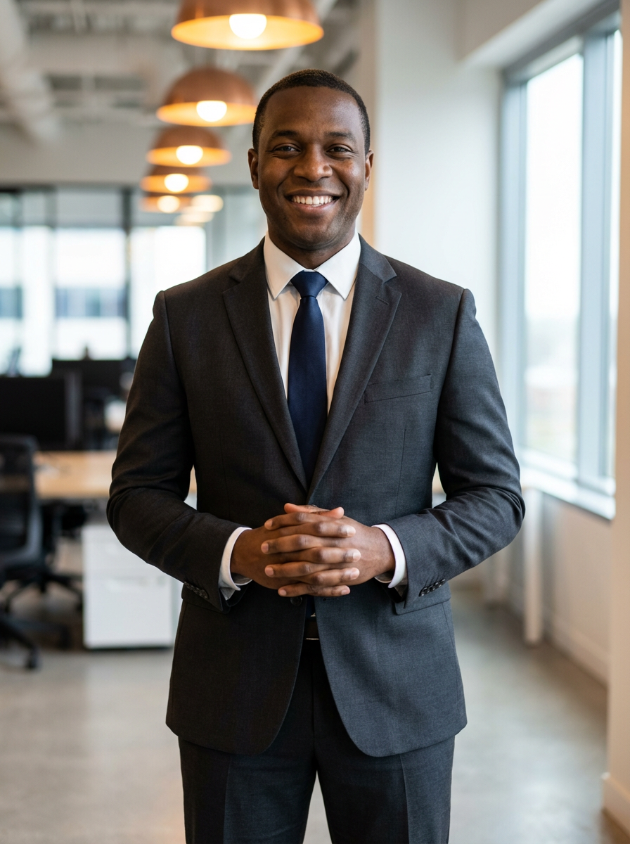 headshot of model, crisp details, executive attire, confident posture, happy expression, high-definition, sharp focus, ambient lighting, business professional, Background features a modern office setting blurred office furniture, and overhead lighting. The atmosphere is bright with natural and artificial light.