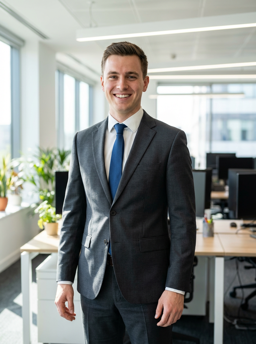 headshot of model, crisp details, executive attire, confident posture, happy expression, high-definition, sharp focus, ambient lighting, business professional, Background features a modern office setting blurred office furniture, and overhead lighting. The atmosphere is bright with natural and artificial light.
