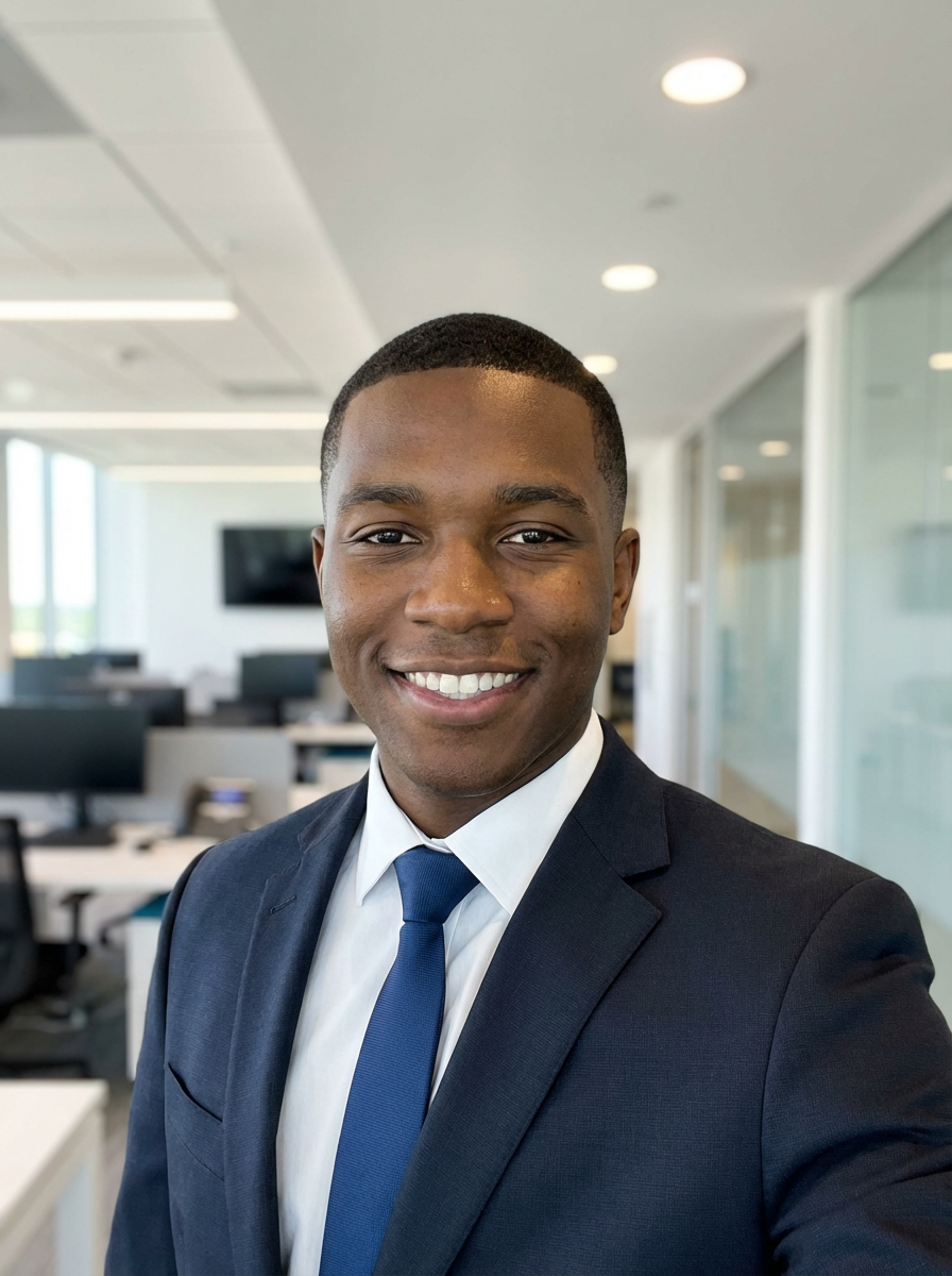 headshot of model, crisp details, executive attire, confident posture, happy expression, high-definition, sharp focus, ambient lighting, business professional, Background features a modern office setting blurred office furniture, and overhead lighting. The atmosphere is bright with natural and artificial light.