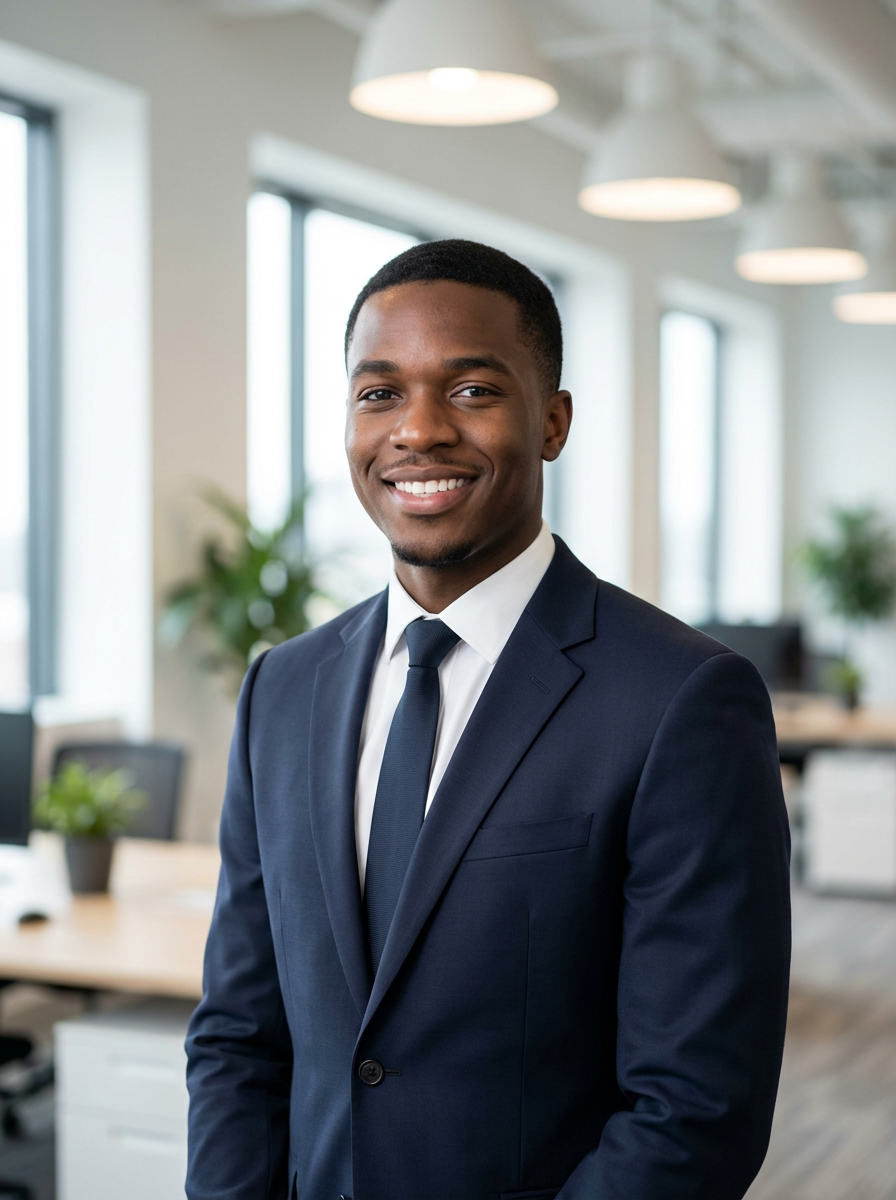 headshot of model, crisp details, executive attire, confident posture, happy expression, high-definition, sharp focus, ambient lighting, business professional, Background features a modern office setting blurred office furniture, and overhead lighting. The atmosphere is bright with natural and artificial light.