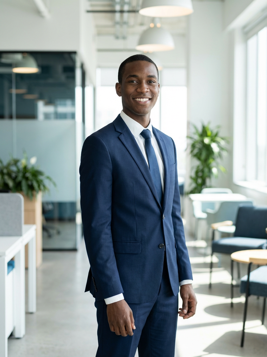 headshot of model, crisp details, executive attire, confident posture, happy expression, high-definition, sharp focus, ambient lighting, business professional, Background features a modern office setting blurred office furniture, and overhead lighting. The atmosphere is bright with natural and artificial light.