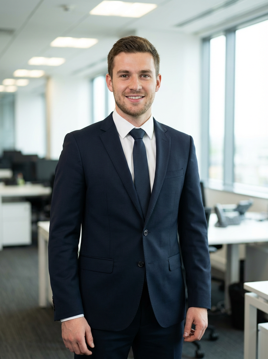 headshot of model, crisp details, executive attire, confident posture, happy expression, high-definition, sharp focus, ambient lighting, business professional, Background features a modern office setting blurred office furniture, and overhead lighting. The atmosphere is bright with natural and artificial light.