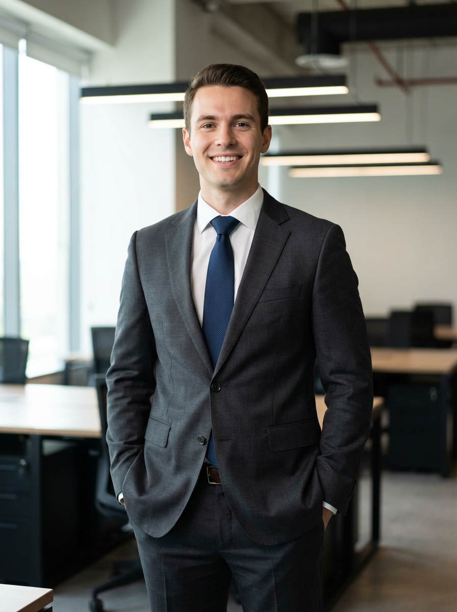 headshot of model, crisp details, executive attire, confident posture, happy expression, high-definition, sharp focus, ambient lighting, business professional, Background features a modern office setting blurred office furniture, and overhead lighting. The atmosphere is bright with natural and artificial light.