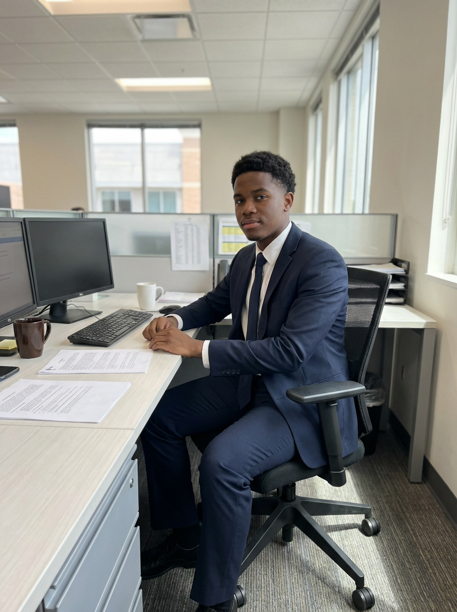 headshot of model, sitting at a desk, at a (office), shirt and tie and suit pants