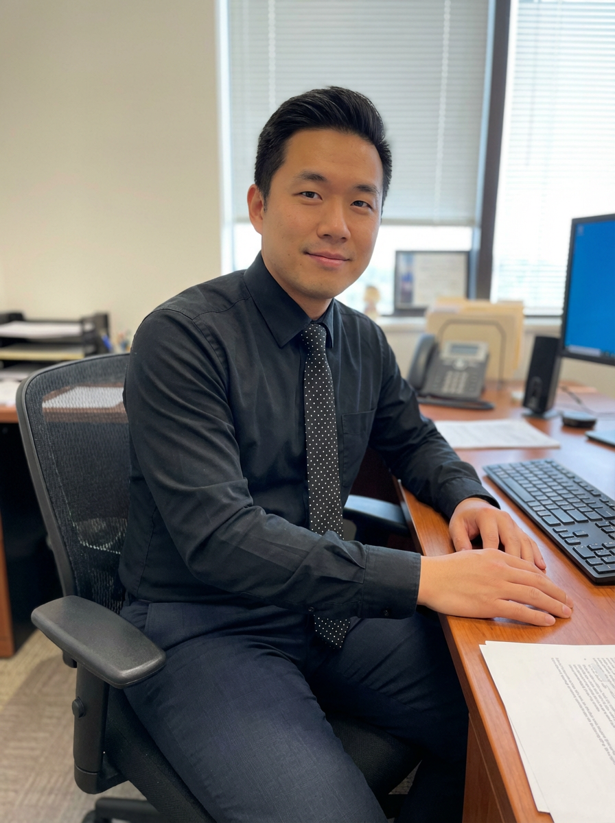 headshot of model, sitting at a desk, at a (office), shirt and tie and suit pants