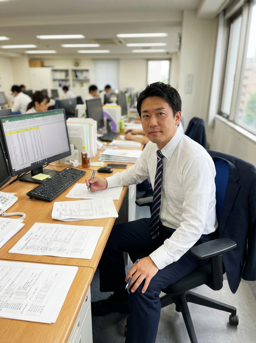 headshot of model, sitting at a desk, at a (office), shirt and tie and suit pants