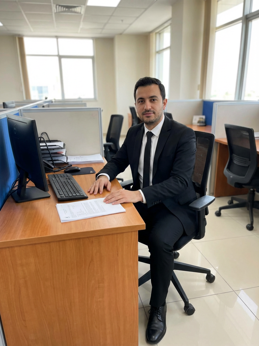 headshot of model, sitting at a desk, at a (office), shirt and tie and suit pants