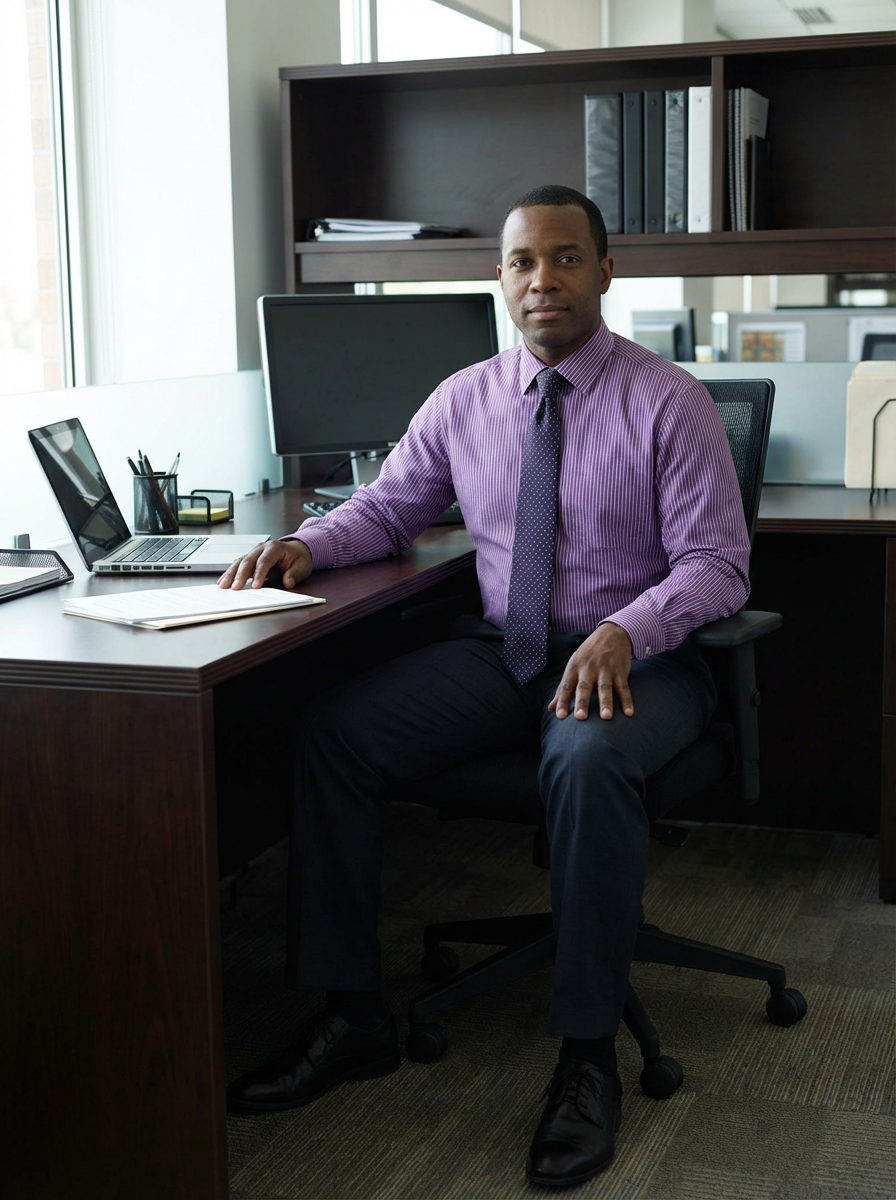 headshot of model, sitting at a desk, at a (office), shirt and tie and suit pants