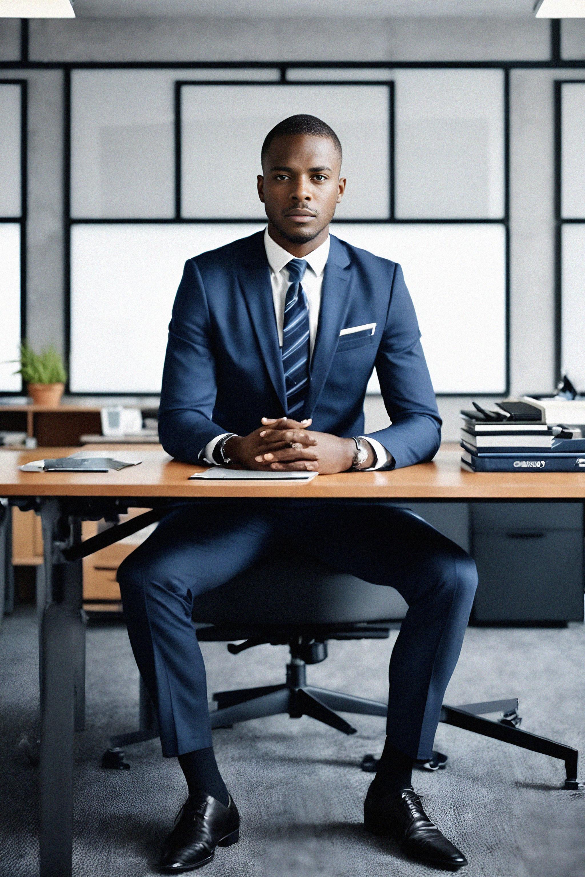 headshot of model, sitting at a desk, at a (office), shirt and tie and suit pants