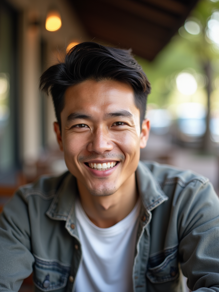 headshot of model, smiling warmly, natural light, blurred background (cafe or park), casual clothing, approachable expression