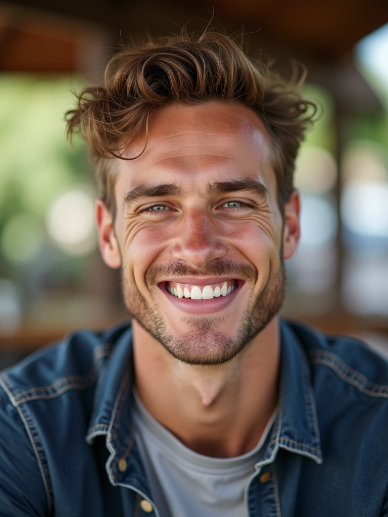headshot of model, smiling warmly, natural light, blurred background (cafe or park), casual clothing, approachable expression