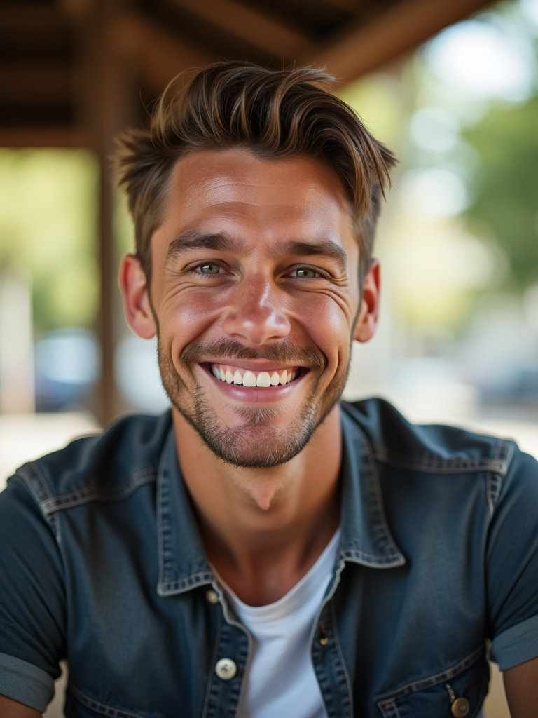 headshot of model, smiling warmly, natural light, blurred background (cafe or park), casual clothing, approachable expression