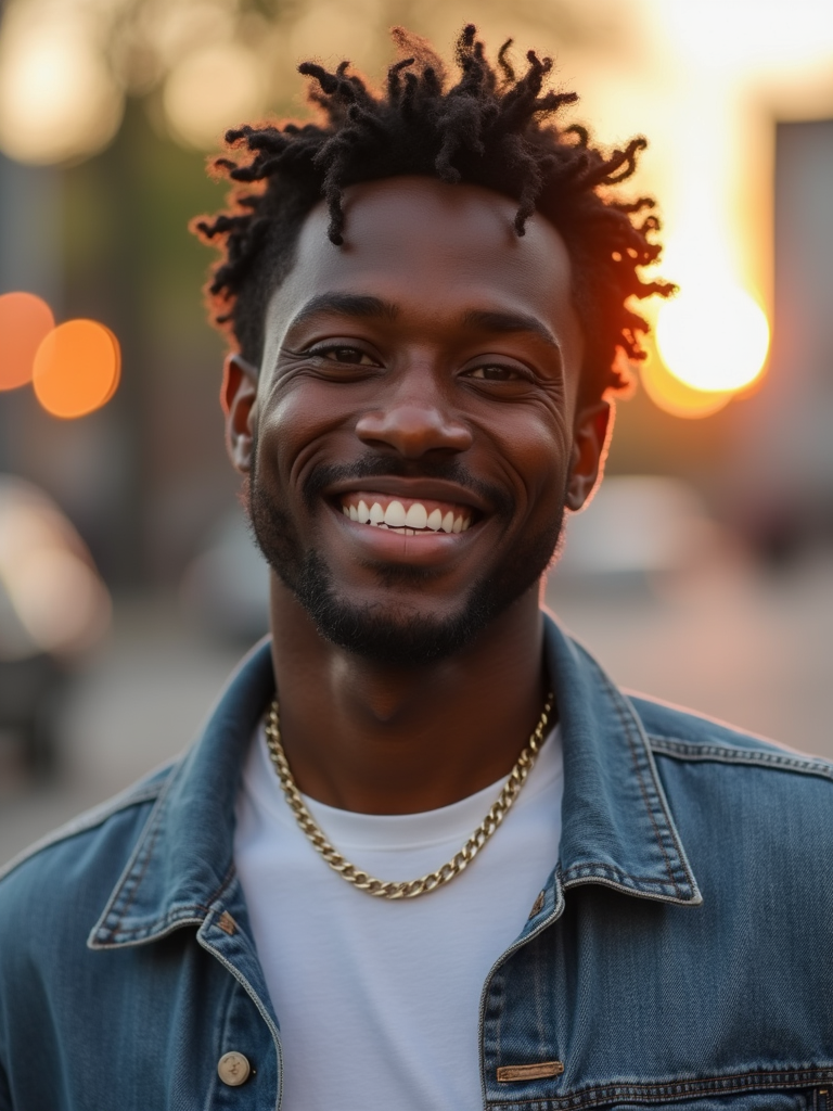 headshot of smiling model wearing casual clothes posing for dating app headshot. outdoor blurry background. the lighting is warm, possibly from a setting sun, creating a soft glow around him, enhancing the casual and relaxed vibe of the image. the setting seems to be outdoors, likely in an urban environment, with the blurred background hinting at a street or park-like area. this image likely portrays a youthful, active, and approachable individual, possibly in a lifestyle or fashion-related context.