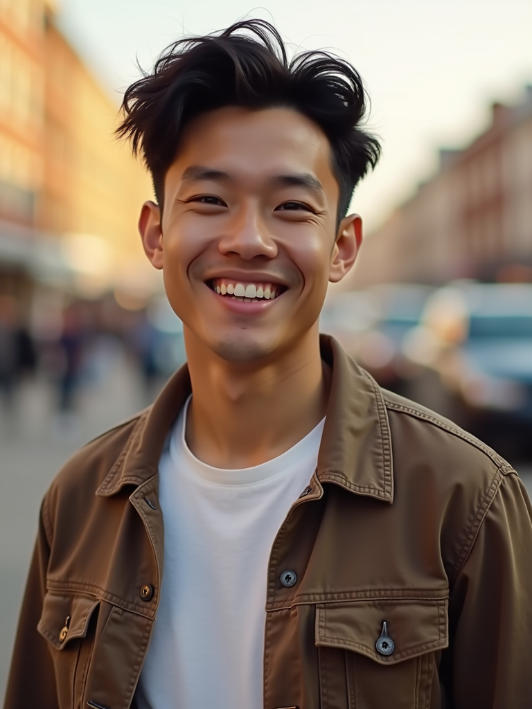 headshot of smiling model wearing casual clothes posing for dating app headshot. outdoor blurry background. the lighting is warm, possibly from a setting sun, creating a soft glow around him, enhancing the casual and relaxed vibe of the image. the setting seems to be outdoors, likely in an urban environment, with the blurred background hinting at a street or park-like area. this image likely portrays a youthful, active, and approachable individual, possibly in a lifestyle or fashion-related context.