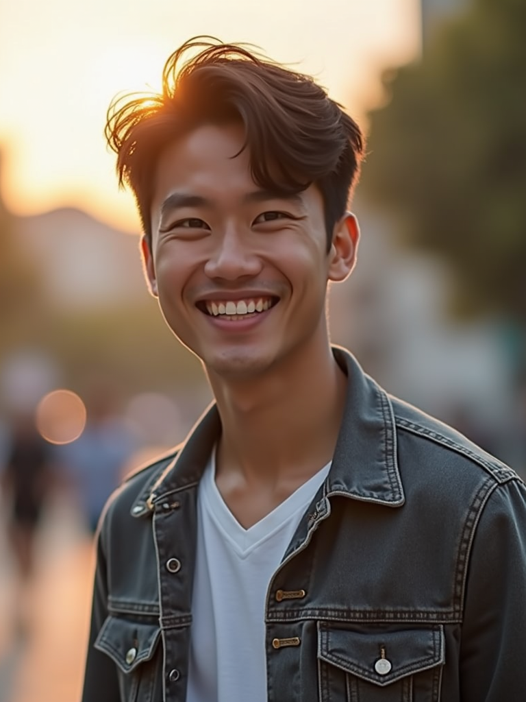 headshot of smiling model wearing casual clothes posing for dating app headshot. outdoor blurry background. the lighting is warm, possibly from a setting sun, creating a soft glow around him, enhancing the casual and relaxed vibe of the image. the setting seems to be outdoors, likely in an urban environment, with the blurred background hinting at a street or park-like area. this image likely portrays a youthful, active, and approachable individual, possibly in a lifestyle or fashion-related context.
