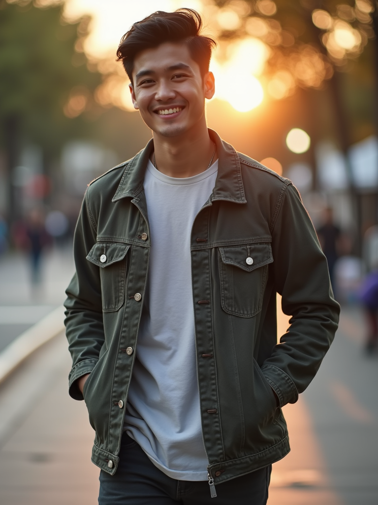 headshot of smiling model wearing casual clothes posing for dating app headshot. outdoor blurry background. the lighting is warm, possibly from a setting sun, creating a soft glow around him, enhancing the casual and relaxed vibe of the image. the setting seems to be outdoors, likely in an urban environment, with the blurred background hinting at a street or park-like area. this image likely portrays a youthful, active, and approachable individual, possibly in a lifestyle or fashion-related context.