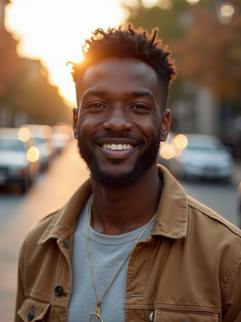 headshot of smiling model wearing casual clothes posing for dating app headshot. outdoor blurry background. the lighting is warm, possibly from a setting sun, creating a soft glow around him, enhancing the casual and relaxed vibe of the image. the setting seems to be outdoors, likely in an urban environment, with the blurred background hinting at a street or park-like area. this image likely portrays a youthful, active, and approachable individual, possibly in a lifestyle or fashion-related context.