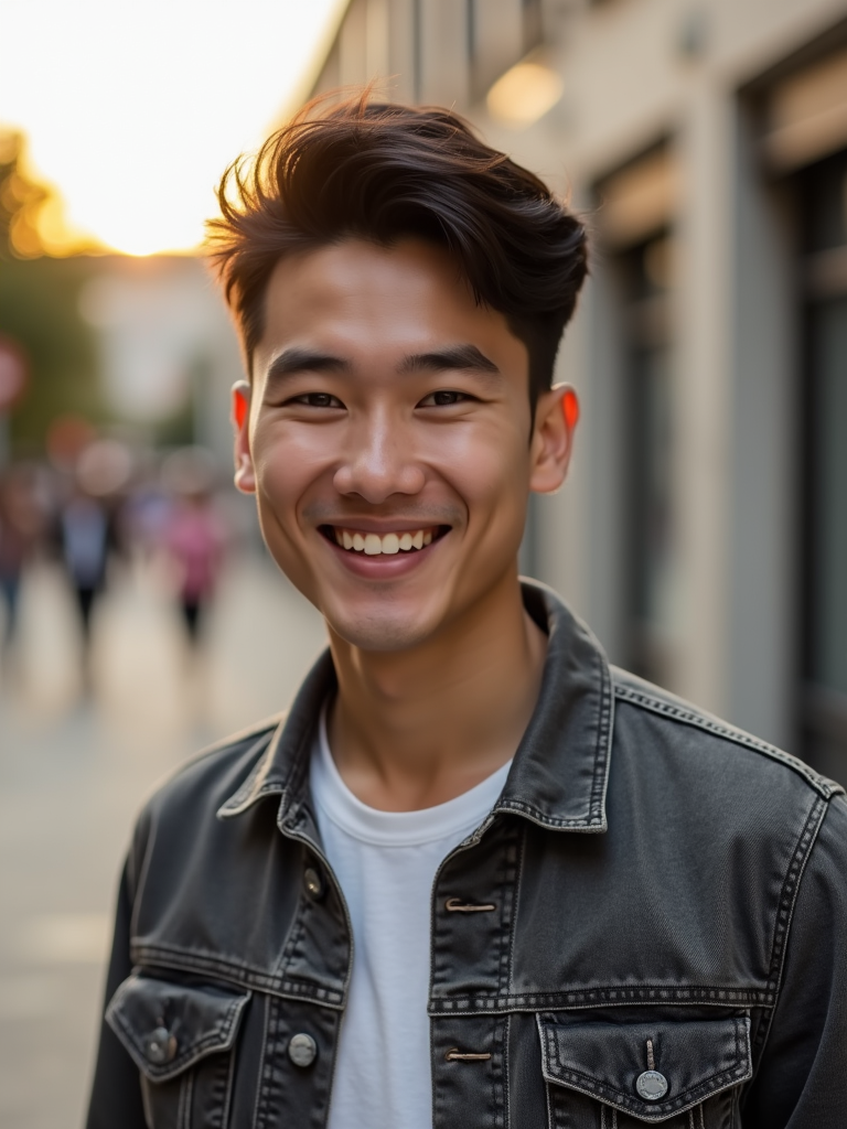 headshot of smiling model wearing casual clothes posing for dating app headshot. outdoor blurry background. the lighting is warm, possibly from a setting sun, creating a soft glow around him, enhancing the casual and relaxed vibe of the image. the setting seems to be outdoors, likely in an urban environment, with the blurred background hinting at a street or park-like area. this image likely portrays a youthful, active, and approachable individual, possibly in a lifestyle or fashion-related context.