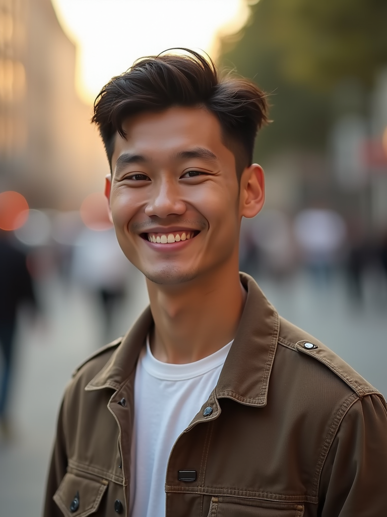headshot of smiling model wearing casual clothes posing for dating app headshot. outdoor blurry background. the lighting is warm, possibly from a setting sun, creating a soft glow around him, enhancing the casual and relaxed vibe of the image. the setting seems to be outdoors, likely in an urban environment, with the blurred background hinting at a street or park-like area. this image likely portrays a youthful, active, and approachable individual, possibly in a lifestyle or fashion-related context.