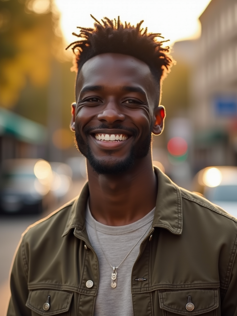 headshot of smiling model wearing casual clothes posing for dating app headshot. outdoor blurry background. the lighting is warm, possibly from a setting sun, creating a soft glow around him, enhancing the casual and relaxed vibe of the image. the setting seems to be outdoors, likely in an urban environment, with the blurred background hinting at a street or park-like area. this image likely portrays a youthful, active, and approachable individual, possibly in a lifestyle or fashion-related context.