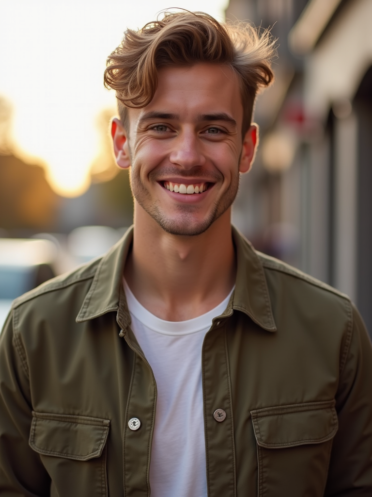 headshot of smiling model wearing casual clothes posing for dating app headshot. outdoor blurry background. the lighting is warm, possibly from a setting sun, creating a soft glow around him, enhancing the casual and relaxed vibe of the image. the setting seems to be outdoors, likely in an urban environment, with the blurred background hinting at a street or park-like area. this image likely portrays a youthful, active, and approachable individual, possibly in a lifestyle or fashion-related context.