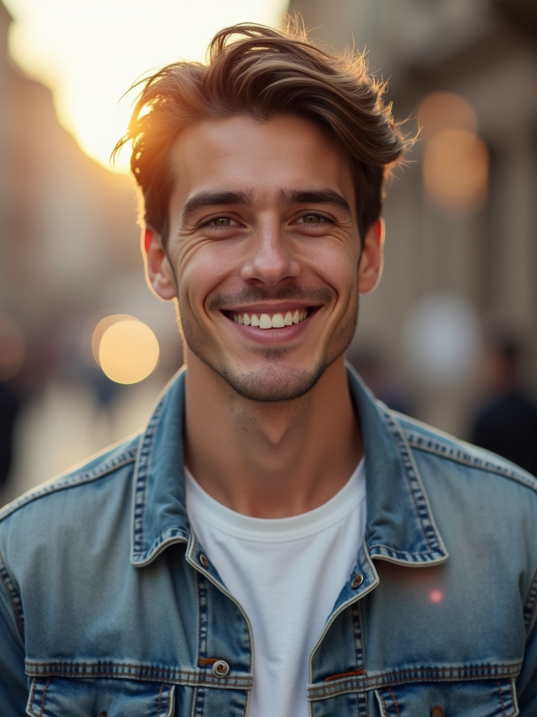 headshot of smiling model wearing casual clothes posing for dating app headshot. outdoor blurry background. the lighting is warm, possibly from a setting sun, creating a soft glow around him, enhancing the casual and relaxed vibe of the image. the setting seems to be outdoors, likely in an urban environment, with the blurred background hinting at a street or park-like area. this image likely portrays a youthful, active, and approachable individual, possibly in a lifestyle or fashion-related context.