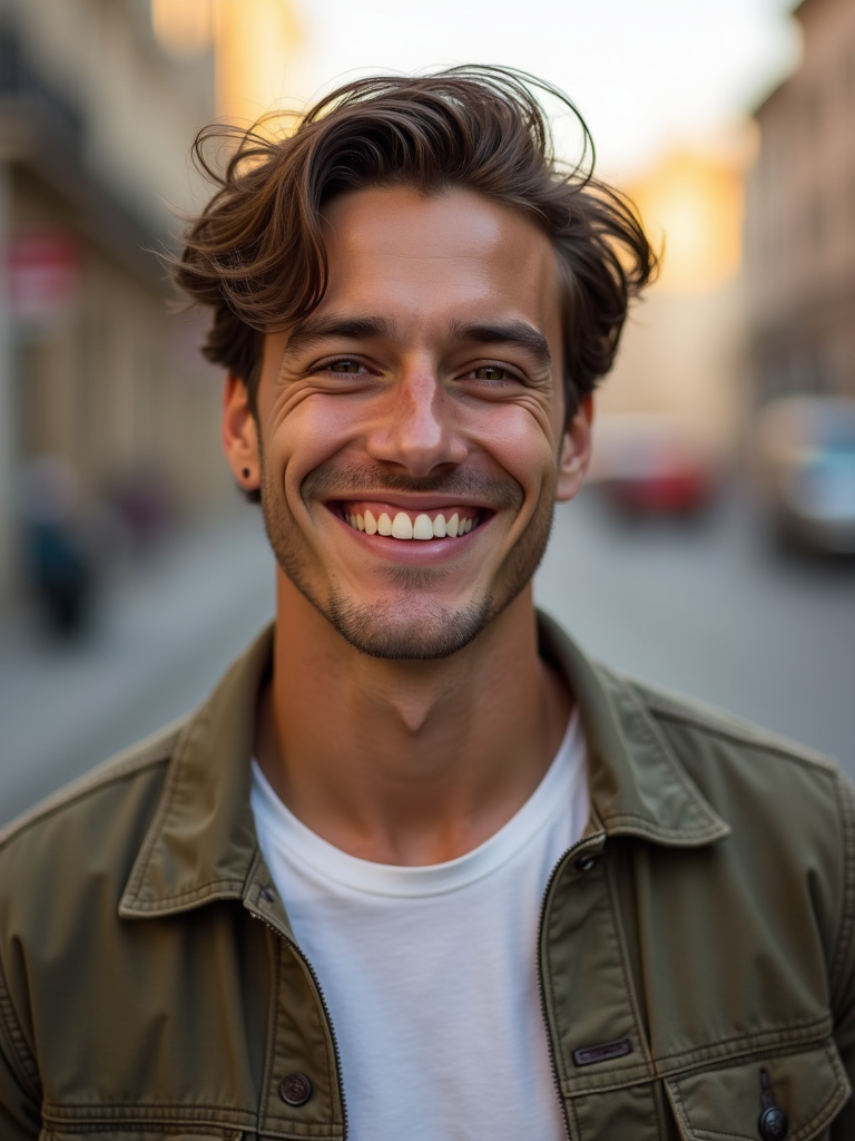 headshot of smiling model wearing casual clothes posing for dating app headshot. outdoor blurry background. the lighting is warm, possibly from a setting sun, creating a soft glow around him, enhancing the casual and relaxed vibe of the image. the setting seems to be outdoors, likely in an urban environment, with the blurred background hinting at a street or park-like area. this image likely portrays a youthful, active, and approachable individual, possibly in a lifestyle or fashion-related context.
