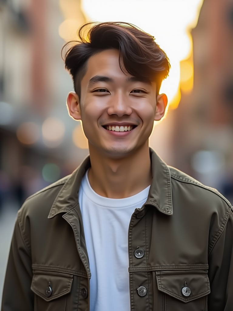 headshot of smiling model wearing casual clothes posing for dating app headshot. outdoor blurry background. the lighting is warm, possibly from a setting sun, creating a soft glow around him, enhancing the casual and relaxed vibe of the image. the setting seems to be outdoors, likely in an urban environment, with the blurred background hinting at a street or park-like area. this image likely portrays a youthful, active, and approachable individual, possibly in a lifestyle or fashion-related context.