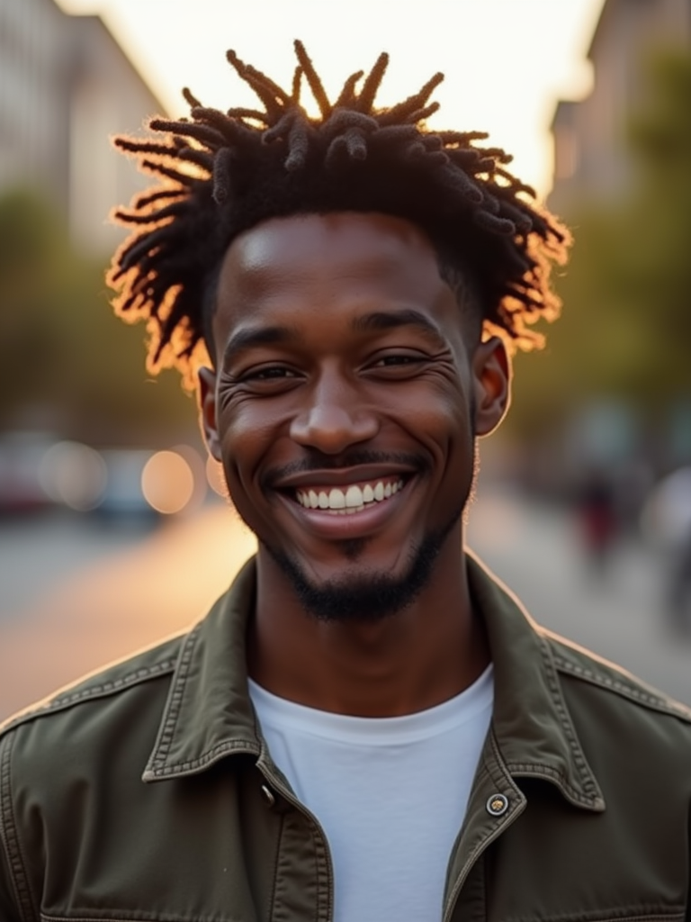 headshot of smiling model wearing casual clothes posing for dating app headshot. outdoor blurry background. the lighting is warm, possibly from a setting sun, creating a soft glow around him, enhancing the casual and relaxed vibe of the image. the setting seems to be outdoors, likely in an urban environment, with the blurred background hinting at a street or park-like area. this image likely portrays a youthful, active, and approachable individual, possibly in a lifestyle or fashion-related context.