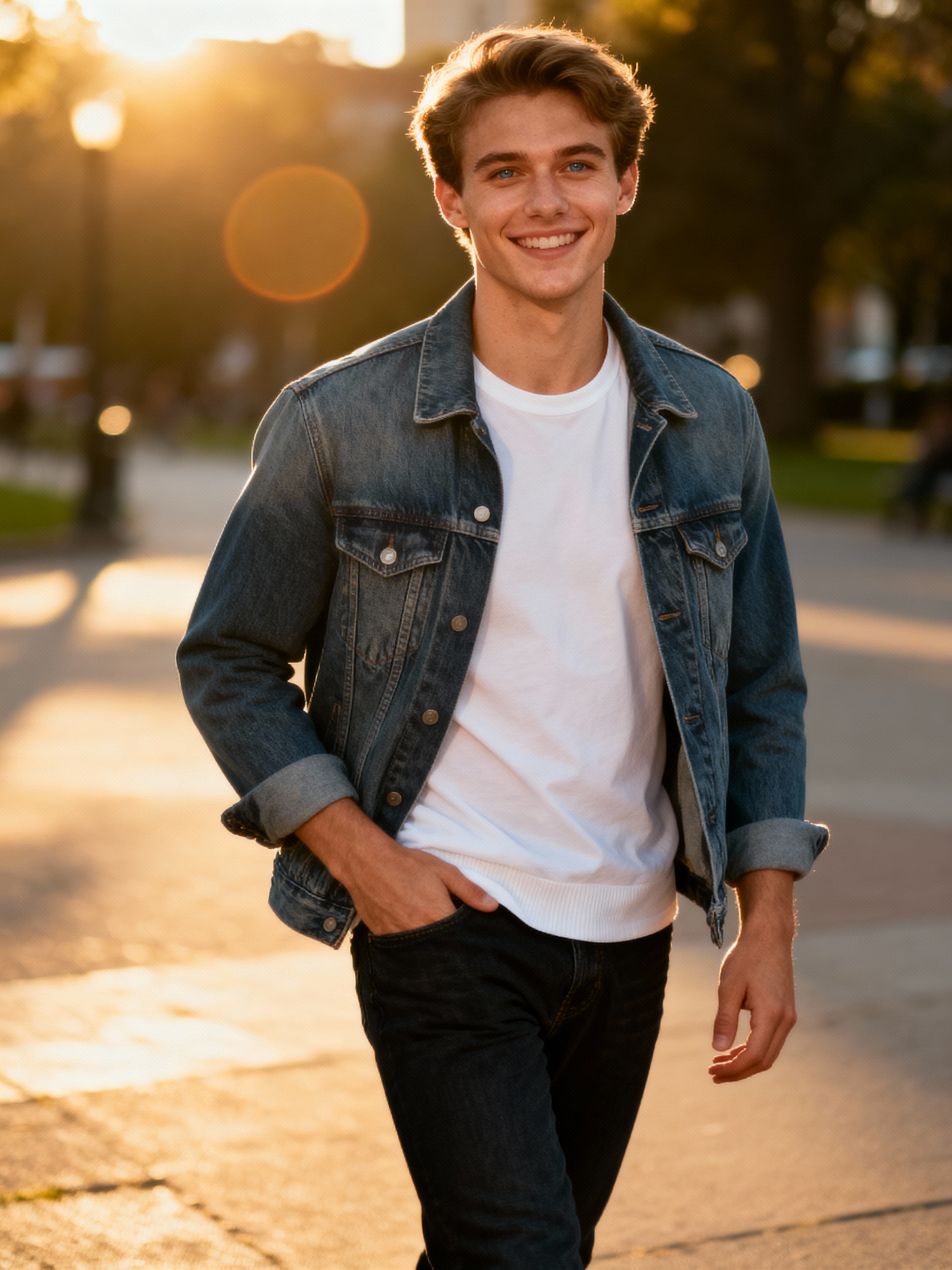 headshot of smiling model wearing casual clothes posing for dating app headshot. outdoor blurry background. the lighting is warm, possibly from a setting sun, creating a soft glow around him, enhancing the casual and relaxed vibe of the image. the setting seems to be outdoors, likely in an urban environment, with the blurred background hinting at a street or park-like area. this image likely portrays a youthful, active, and approachable individual, possibly in a lifestyle or fashion-related context.