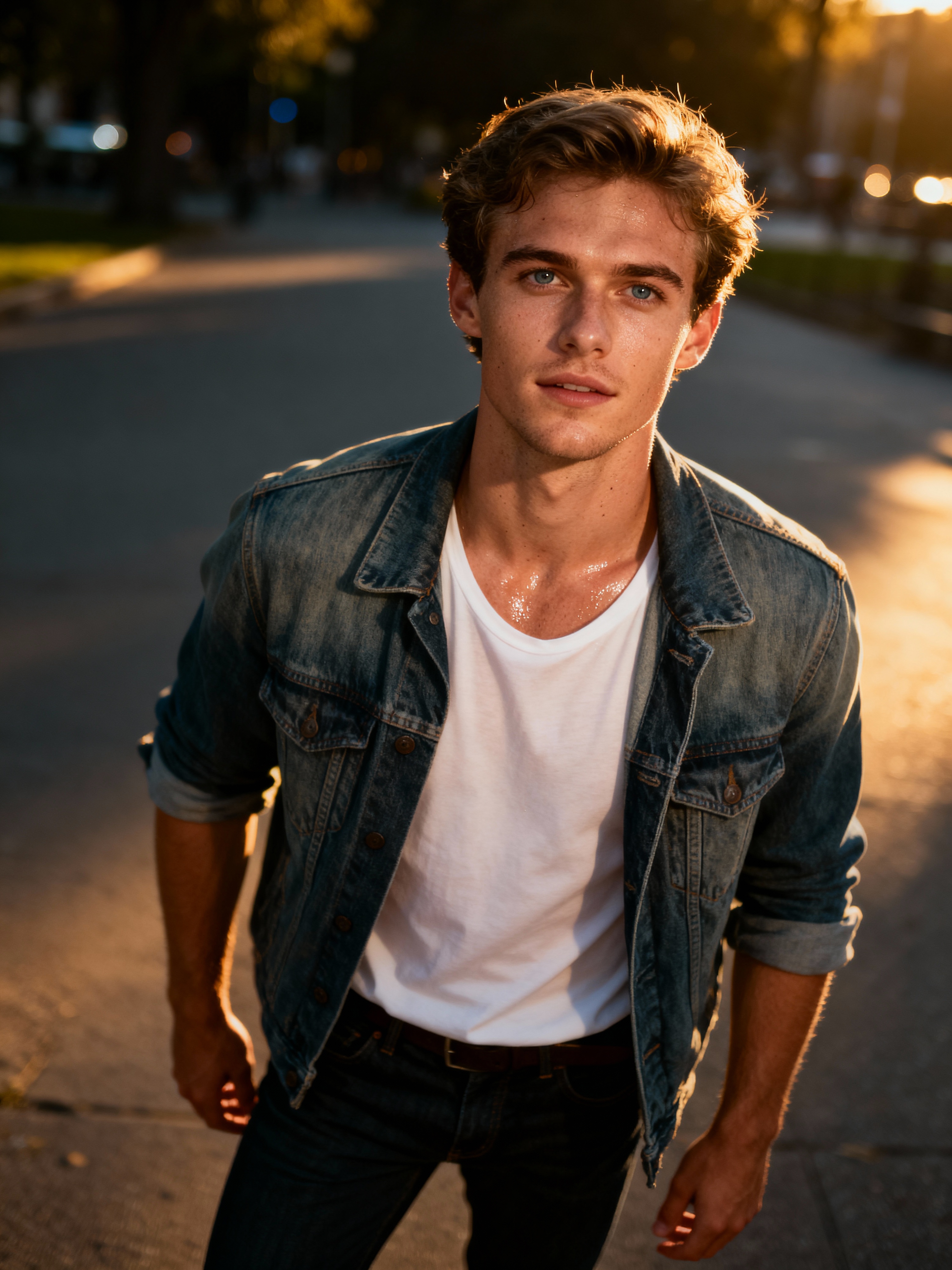 headshot of smiling model wearing casual clothes posing for dating app headshot. outdoor blurry background. the lighting is warm, possibly from a setting sun, creating a soft glow around him, enhancing the casual and relaxed vibe of the image. the setting seems to be outdoors, likely in an urban environment, with the blurred background hinting at a street or park-like area. this image likely portrays a youthful, active, and approachable individual, possibly in a lifestyle or fashion-related context.