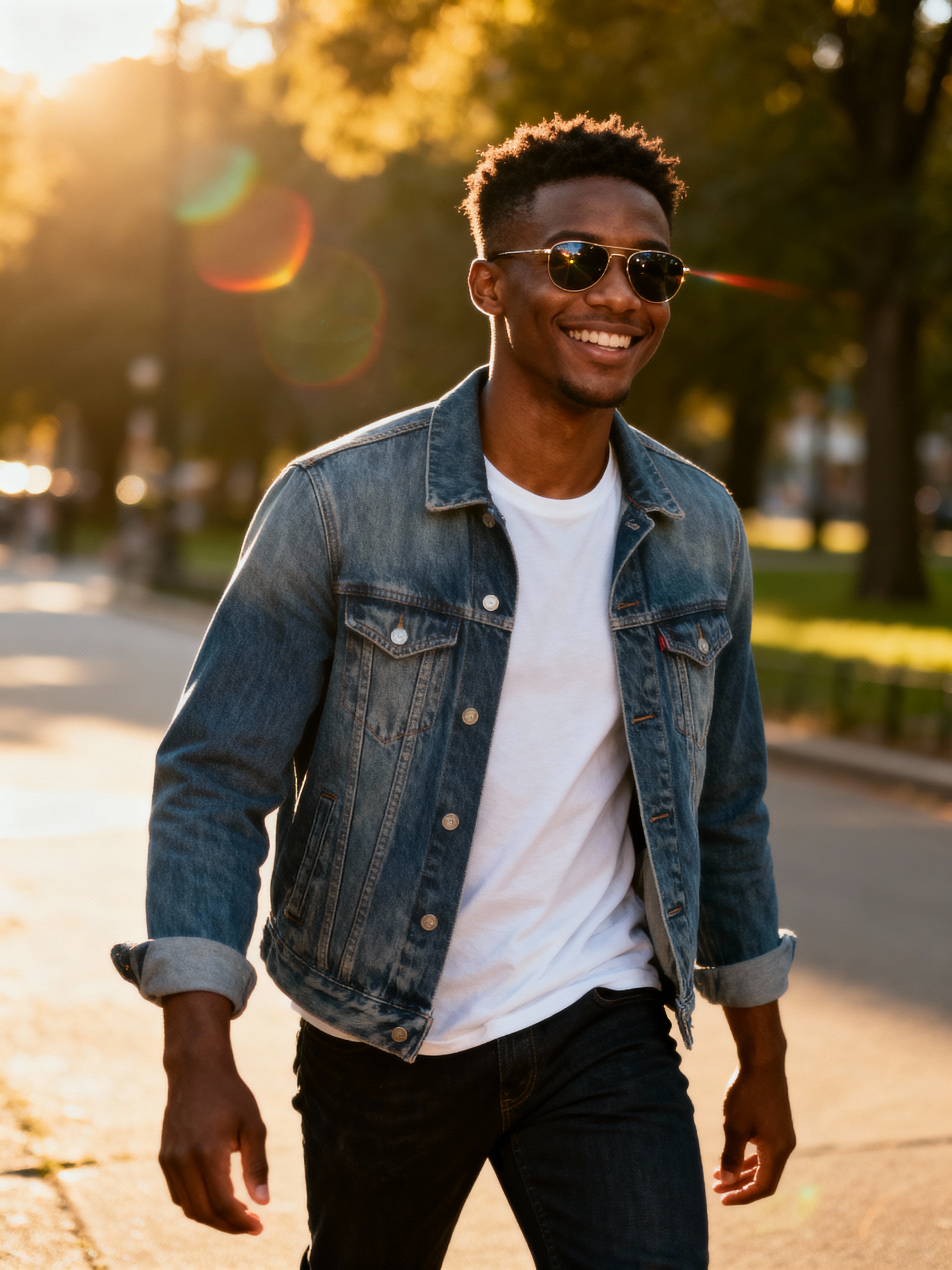 headshot of smiling model wearing casual clothes posing for dating app headshot. outdoor blurry background. the lighting is warm, possibly from a setting sun, creating a soft glow around him, enhancing the casual and relaxed vibe of the image. the setting seems to be outdoors, likely in an urban environment, with the blurred background hinting at a street or park-like area. this image likely portrays a youthful, active, and approachable individual, possibly in a lifestyle or fashion-related context.