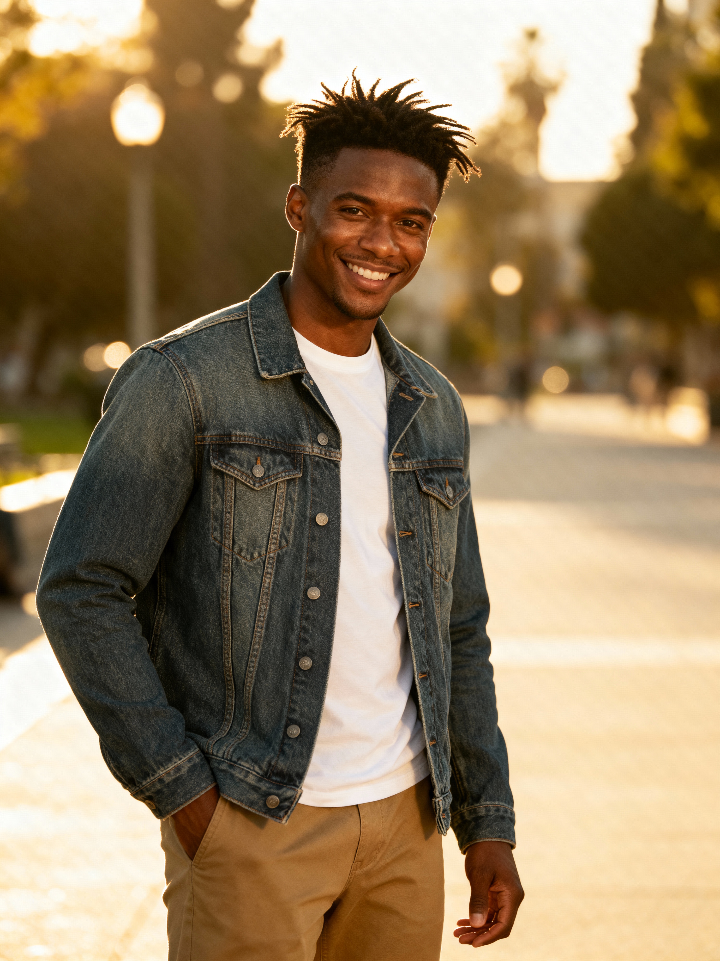 headshot of smiling model wearing casual clothes posing for dating app headshot. outdoor blurry background. the lighting is warm, possibly from a setting sun, creating a soft glow around him, enhancing the casual and relaxed vibe of the image. the setting seems to be outdoors, likely in an urban environment, with the blurred background hinting at a street or park-like area. this image likely portrays a youthful, active, and approachable individual, possibly in a lifestyle or fashion-related context.