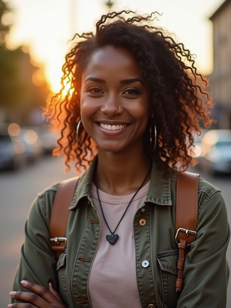 headshot of smiling model wearing casual clothes posing for dating app headshot. outdoor blurry background. the lighting is warm, possibly from a setting sun, creating a soft glow around him, enhancing the casual and relaxed vibe of the image. the setting seems to be outdoors, likely in an urban environment, with the blurred background hinting at a street or park-like area. this image likely portrays a youthful, active, and approachable individual, possibly in a lifestyle or fashion-related context.