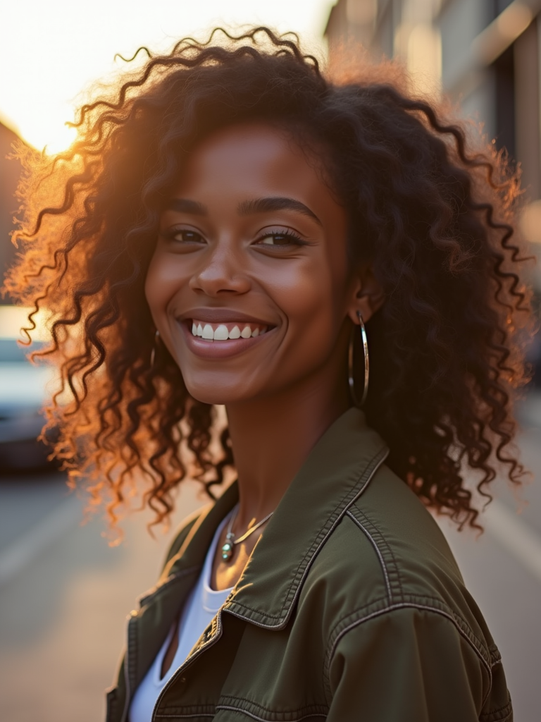 headshot of smiling model wearing casual clothes posing for dating app headshot. outdoor blurry background. the lighting is warm, possibly from a setting sun, creating a soft glow around him, enhancing the casual and relaxed vibe of the image. the setting seems to be outdoors, likely in an urban environment, with the blurred background hinting at a street or park-like area. this image likely portrays a youthful, active, and approachable individual, possibly in a lifestyle or fashion-related context.