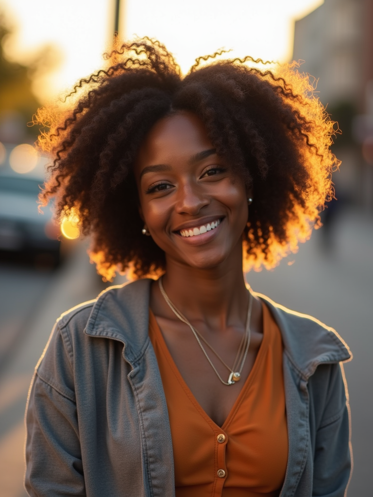 headshot of smiling model wearing casual clothes posing for dating app headshot. outdoor blurry background. the lighting is warm, possibly from a setting sun, creating a soft glow around him, enhancing the casual and relaxed vibe of the image. the setting seems to be outdoors, likely in an urban environment, with the blurred background hinting at a street or park-like area. this image likely portrays a youthful, active, and approachable individual, possibly in a lifestyle or fashion-related context.