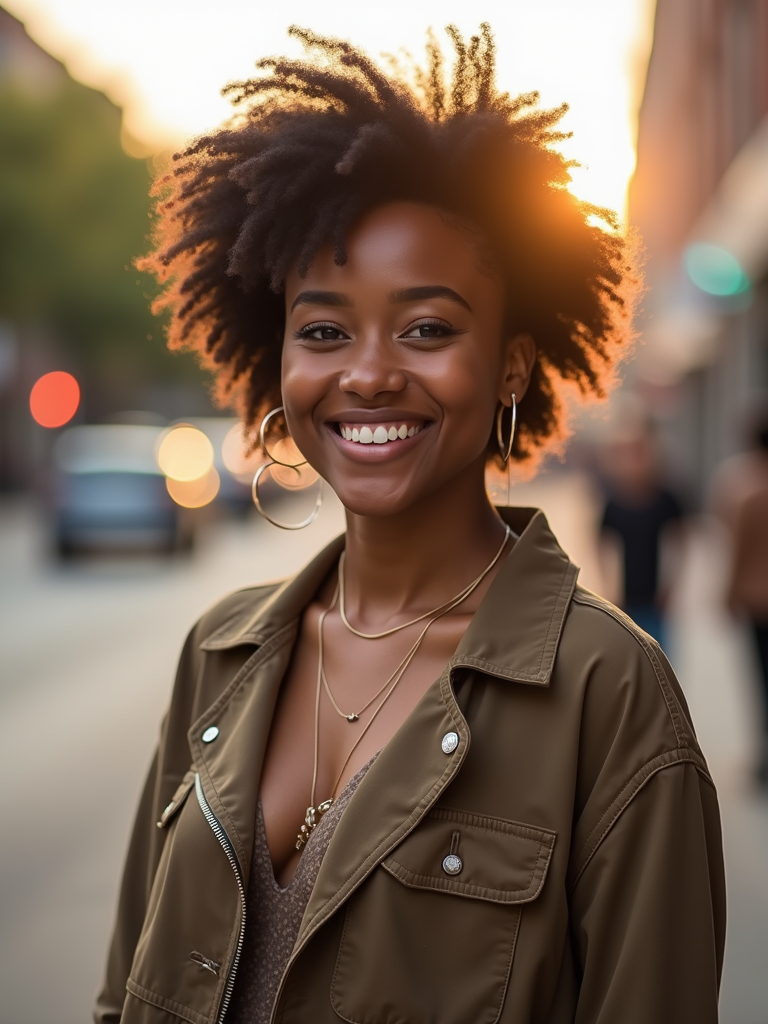 headshot of smiling model wearing casual clothes posing for dating app headshot. outdoor blurry background. the lighting is warm, possibly from a setting sun, creating a soft glow around him, enhancing the casual and relaxed vibe of the image. the setting seems to be outdoors, likely in an urban environment, with the blurred background hinting at a street or park-like area. this image likely portrays a youthful, active, and approachable individual, possibly in a lifestyle or fashion-related context.