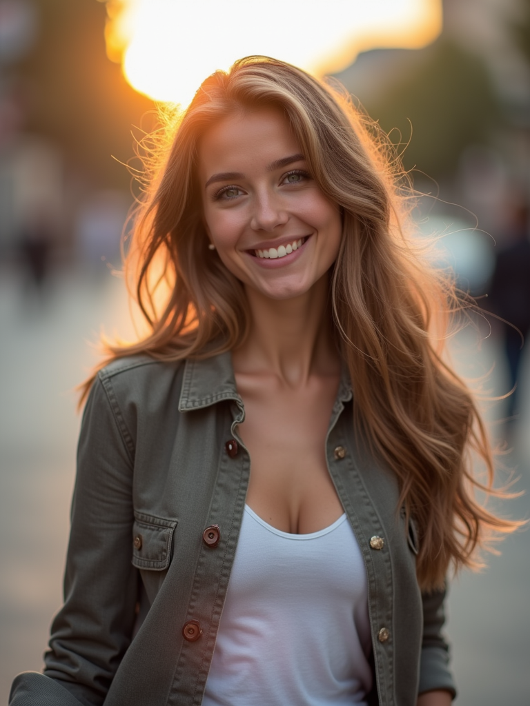 headshot of smiling model wearing casual clothes posing for dating app headshot. outdoor blurry background. the lighting is warm, possibly from a setting sun, creating a soft glow around him, enhancing the casual and relaxed vibe of the image. the setting seems to be outdoors, likely in an urban environment, with the blurred background hinting at a street or park-like area. this image likely portrays a youthful, active, and approachable individual, possibly in a lifestyle or fashion-related context.