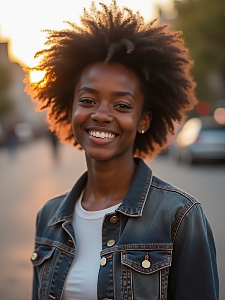 headshot of smiling model wearing casual clothes posing for dating app headshot. outdoor blurry background. the lighting is warm, possibly from a setting sun, creating a soft glow around him, enhancing the casual and relaxed vibe of the image. the setting seems to be outdoors, likely in an urban environment, with the blurred background hinting at a street or park-like area. this image likely portrays a youthful, active, and approachable individual, possibly in a lifestyle or fashion-related context.