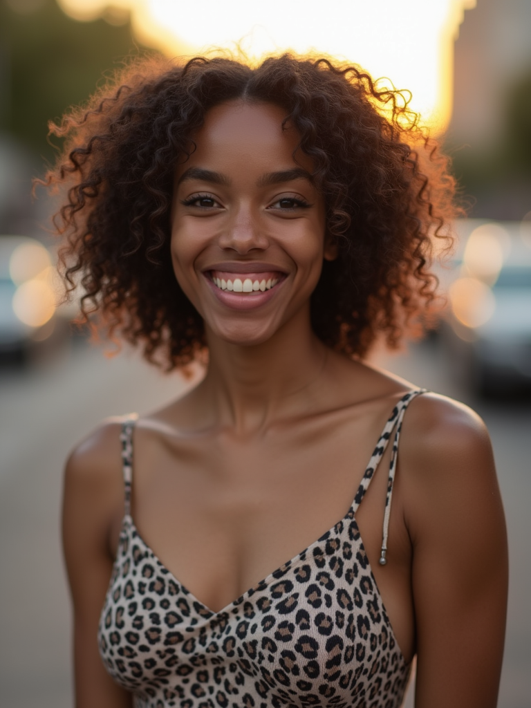 headshot of smiling model wearing casual clothes posing for dating app headshot. outdoor blurry background. the lighting is warm, possibly from a setting sun, creating a soft glow around him, enhancing the casual and relaxed vibe of the image. the setting seems to be outdoors, likely in an urban environment, with the blurred background hinting at a street or park-like area. this image likely portrays a youthful, active, and approachable individual, possibly in a lifestyle or fashion-related context.