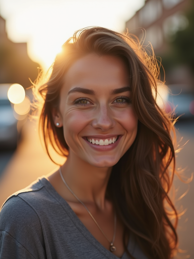 headshot of smiling model wearing casual clothes posing for dating app headshot. outdoor blurry background. the lighting is warm, possibly from a setting sun, creating a soft glow around him, enhancing the casual and relaxed vibe of the image. the setting seems to be outdoors, likely in an urban environment, with the blurred background hinting at a street or park-like area. this image likely portrays a youthful, active, and approachable individual, possibly in a lifestyle or fashion-related context.