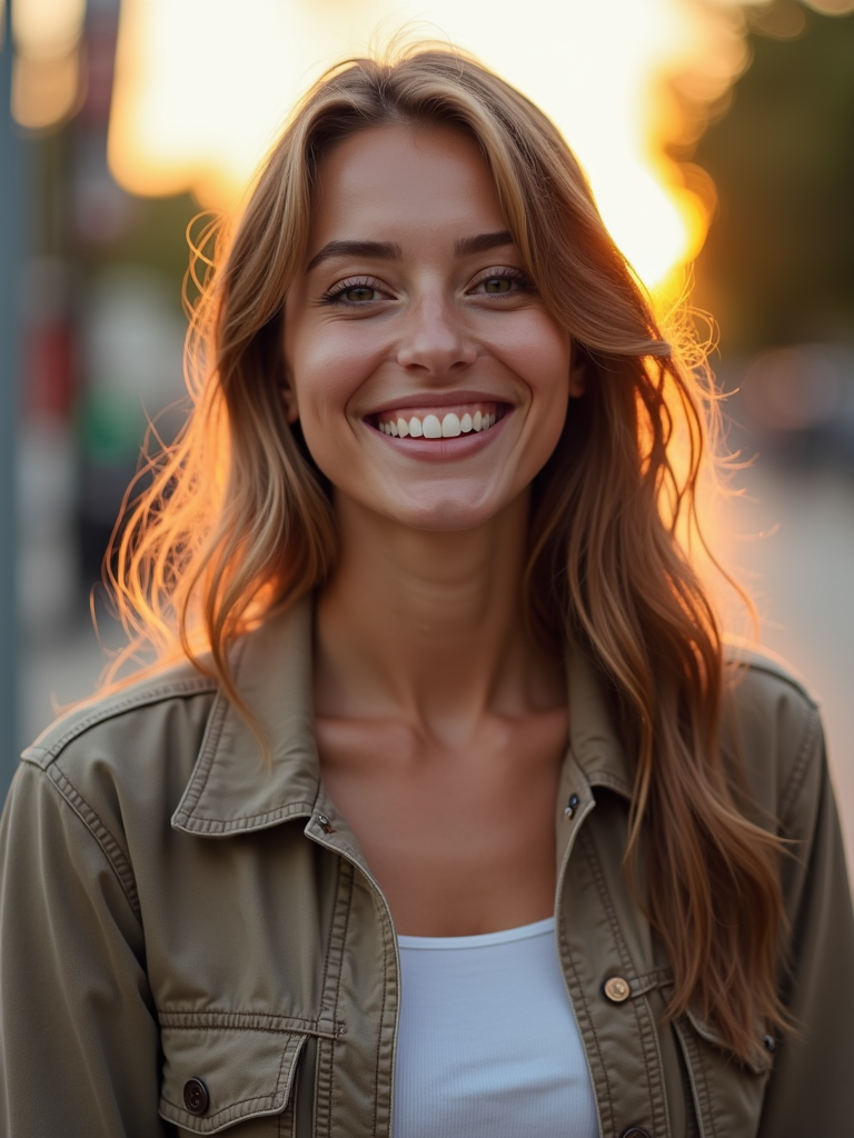 headshot of smiling model wearing casual clothes posing for dating app headshot. outdoor blurry background. the lighting is warm, possibly from a setting sun, creating a soft glow around him, enhancing the casual and relaxed vibe of the image. the setting seems to be outdoors, likely in an urban environment, with the blurred background hinting at a street or park-like area. this image likely portrays a youthful, active, and approachable individual, possibly in a lifestyle or fashion-related context.