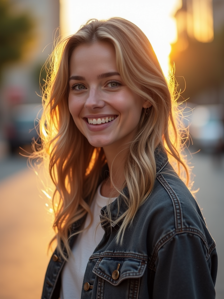 headshot of smiling model wearing casual clothes posing for dating app headshot. outdoor blurry background. the lighting is warm, possibly from a setting sun, creating a soft glow around him, enhancing the casual and relaxed vibe of the image. the setting seems to be outdoors, likely in an urban environment, with the blurred background hinting at a street or park-like area. this image likely portrays a youthful, active, and approachable individual, possibly in a lifestyle or fashion-related context.