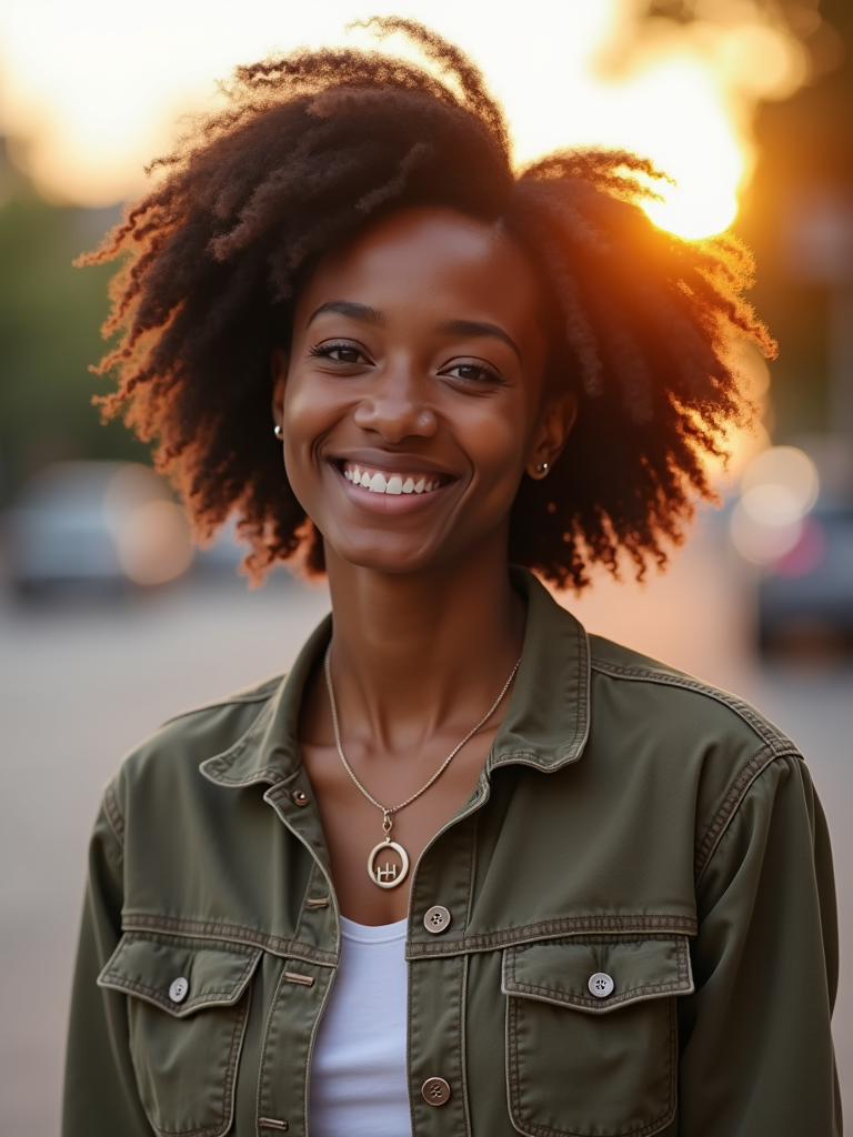 headshot of smiling model wearing casual clothes posing for dating app headshot. outdoor blurry background. the lighting is warm, possibly from a setting sun, creating a soft glow around him, enhancing the casual and relaxed vibe of the image. the setting seems to be outdoors, likely in an urban environment, with the blurred background hinting at a street or park-like area. this image likely portrays a youthful, active, and approachable individual, possibly in a lifestyle or fashion-related context.
