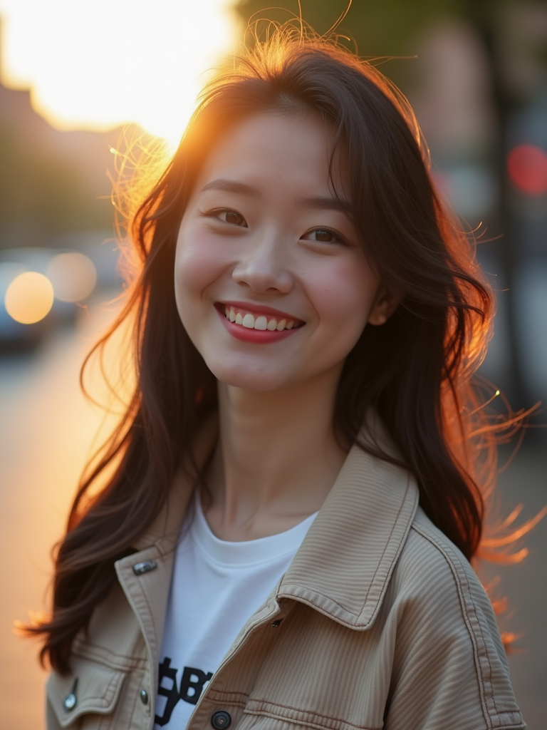 headshot of smiling model wearing casual clothes posing for dating app headshot. outdoor blurry background. the lighting is warm, possibly from a setting sun, creating a soft glow around him, enhancing the casual and relaxed vibe of the image. the setting seems to be outdoors, likely in an urban environment, with the blurred background hinting at a street or park-like area. this image likely portrays a youthful, active, and approachable individual, possibly in a lifestyle or fashion-related context.