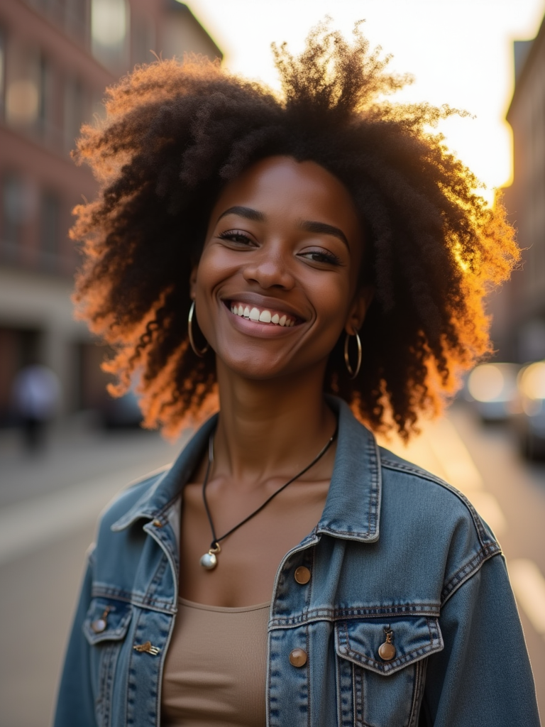 headshot of smiling model wearing casual clothes posing for dating app headshot. outdoor blurry background. the lighting is warm, possibly from a setting sun, creating a soft glow around him, enhancing the casual and relaxed vibe of the image. the setting seems to be outdoors, likely in an urban environment, with the blurred background hinting at a street or park-like area. this image likely portrays a youthful, active, and approachable individual, possibly in a lifestyle or fashion-related context.